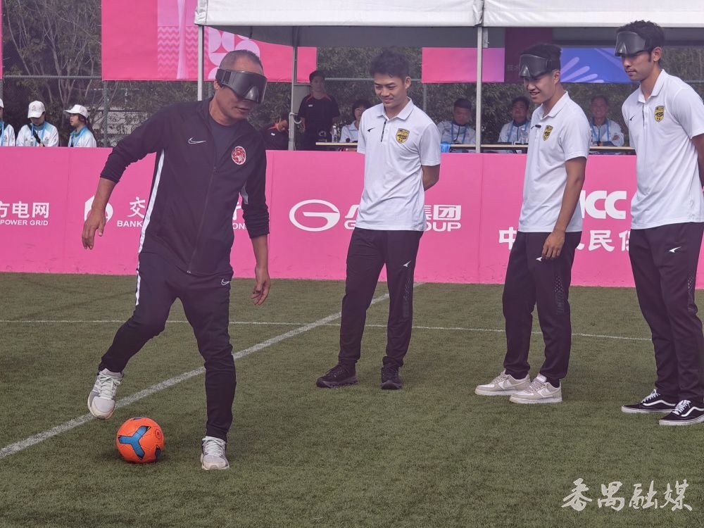 梁学铭正在体验盲人足球运动